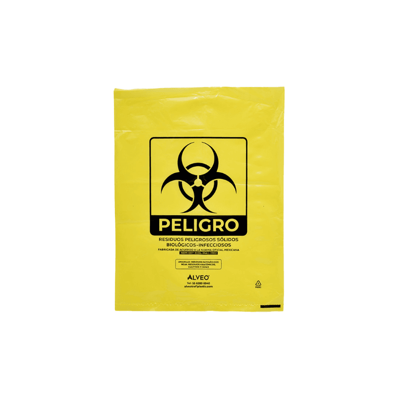 Bolsa de polietileno de baja densidad, libre de metales pesados para la recolección de residuos biológico infecciosos. Carga Máxima: 3 kg. Impresa a una tinta con logotipo de biológico infeccioso. Sin fuelles. Calibre 300. Medidas: Ancho: 30.0 cm. Alto: 40.0 cm. Color: Amarillo.