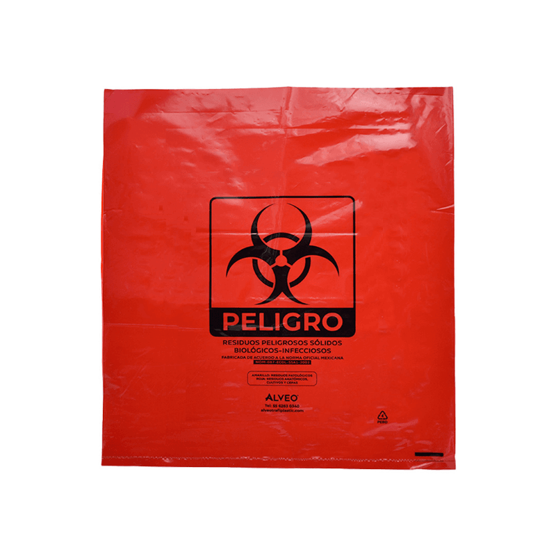 Bolsa de polietileno de baja densidad, libre de metales pesados para la recolección de residuos biológico infecciosos. Carga Máxima: 1 kg. Impresa a una tinta con logotipo de biológico infeccioso. Con fuelles. Calibre 300. Medidas: Ancho: 50.0 cm. Alto: 65.0 cm. Color: Rojo. Pedido mínimo 5,000 piezas.
