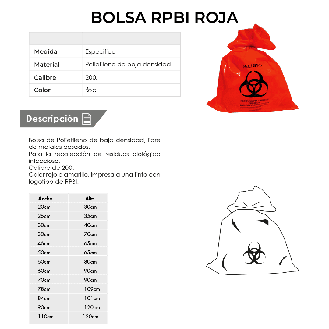 Descripción: Bolsa de polietileno de baja densidad, libre de metales pesados para la recolección de residuos biológico infecciosos. Carga Máxima: 1 kg. Impresa a una tinta con logotipo de biológico infeccioso. Con fuelles. Calibre 300. Medidas: Ancho: 50.0 cm. Alto: 65.0 cm. Color: Rojo. Pedido mínimo 5,000 piezas.